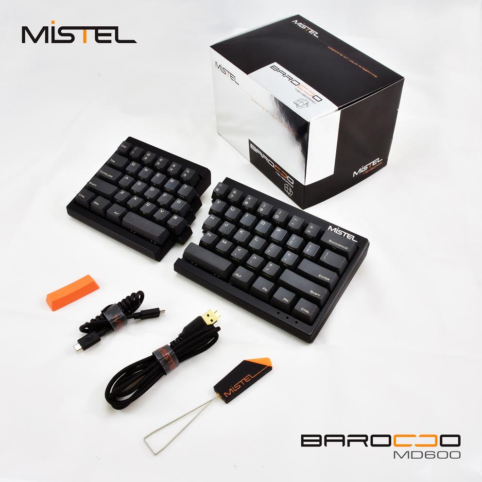 サイズは295.5×124.5×39.5mm(スタンド含まず)、重量は670gで、Mistelオリジナルキーキャップ引き抜き工具、MiniB-AタイプUSBケーブル(専用ケーブルバンド付属)、MicroB -MicroBカールタイプUSBケーブル(専用ケーブルバンド付属)、Enterキー 交換用キーキャップが付属しています。価格はオープンプライス。