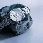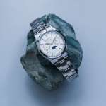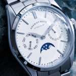 直径34mmとやや小ぶりなケースサイズ、クラシカルなリーフ型の時分針、陶器のような輝きを放つポーセリンホワイトのダイヤルは、過去のマスターピースから着想を得てデザインされたものです。硬質クリスタルガラスを用いたドーム型風防や、外周にコインエッジのような装飾を備えたフラットなケースバックがヴィンテージウォッチを彷彿とさせますが、特筆すべきは6時位置に配置されたムーンフェイズ機構です。