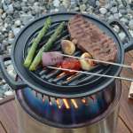 ステンレス製のファイアリングを装着すれば透明感のあるクリーンな炎が渦巻くように立ち上がる様子を情感豊かに楽しむことが可能。頑丈なファイアリングには付属の五徳をセットできるので、クッカーやスキレットを使った直火調理も楽しめます。
