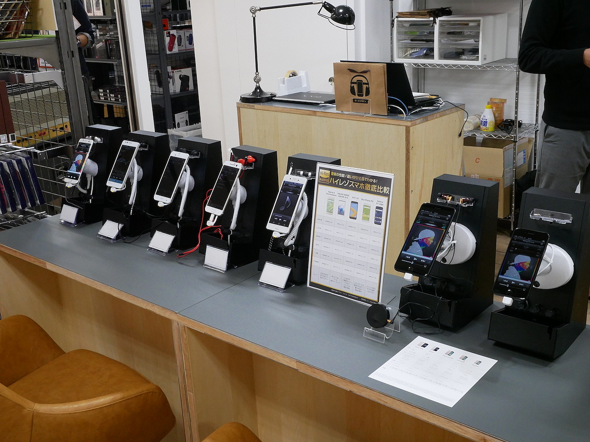 扱うのはハイレゾ対応スマートフォン。各モデルの視聴はもちろん、アプリの紹介からハイレゾ音源の購入方法まで、スマホでハイレゾを楽しむための相談にのってくれるという。もちろん店内にあるイヤホンやヘッドホンを使って音質も試せる。