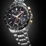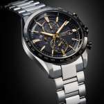 シチズン アテッサからは「ACT Line エコ・ドライブ電波時計 ダイレクトフライト AT8184-57E」(15万9500円、限定数量1300本)が登場。こちらもブラックダイヤルにゴールドのラメを練り込むことで、モダンでスポーティなスタイリングの中に華やかさをプラス。