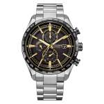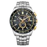 シチズンコレクションから登場の「エコ・ドライブ電波時計 ダイレクトフライト CB5879-53E」(6万8200円、限定数量1300本)は、43mm径の大ぶりなケースに、ゴールドで統一したプッシュボタンやりゅうずが存在感を主張するスポーティなクロノグラフ。