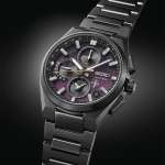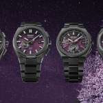 今回のモデルでは星空の下で風に舞う桜の花びらを、オールブラックでまとめた外装と、ラメを散りばめたパープル&ブラックのグラデーションダイヤルで表現。ダイヤルの外周には星が描く軌跡をイメージした同心円状のパターンをあしらい、秒針に添えたピンクゴールドと鏡面仕上げのブレスレットが限定モデルらしい高級感を演出します。