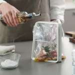 加えて「ポリ袋ホルダー」は、生ゴミ入れの他にも活用法が! 例えば、袋調理の下準備の時。口を開いたままにできるので、食材や調味料を入れやすく、作業もスムーズ。作り置きを保存袋に移し替えるときなどにも活躍しそうです。