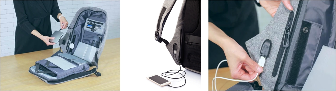 リュック外側にはUSBポートを装備し、 内部のUSBケーブルとお手持ちのモバイルバッテリーをあらかじめつないでおけば、バッテリーをリュックから取り出すことなくモバイル機器の充電も可能になります。