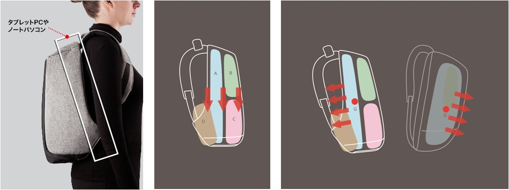 さらに人間工学に基づいた設計により、背中にフィットして荷物の重さが均等に分散。今までのリュックより断然軽く感じられ、1日中背負っていても快適に過ごせます。