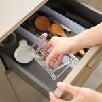 気になる展開・収納構造については、特殊ばねの製造技術を活かし、瞬時に伸縮を可能にしたスプリング機構を採用。無駄をそぎ落とした“一筆書き”のシンプルな構造で、どんなキッチンにも合うミニマルデザインを実現しました。