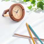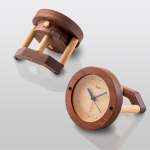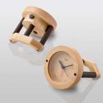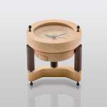 ダイヤルには視認性を考えて無垢のビーチ材を使用、シンプルなドット目盛りとブラック×レッドの針が確かな判読性を提供。また外装とスタンド部は色や感触の違いを楽しめるウォールナットとビーチの異素材使いを採用しており、アラーム音のオンオフ操作や時刻合わせ用ノブ、電池交換のためのスライド式カバーなども全て温かみのある木の素材で統一されているのもユニーク。