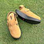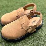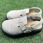 アッパーには高品質なスエードレザーを採用し、ナチュラルで柔らかな印象。甲部分のベルトと金具がアクセントとなり、シンプルながらスタイリッシュなデザインに仕上がっています。