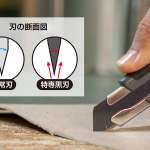 切れ味にももちろんこだわりがあります。購入時に装着されている刃は「特専黒刃」で、これは通常刃よりも研磨角度が鋭いため、より良い切れ味を発揮。加えて、2段研磨を施しているため、鋭角研磨であっても刃こぼれしにくい作りになっています。