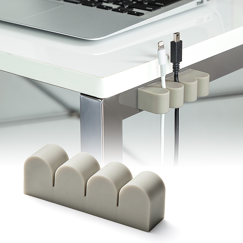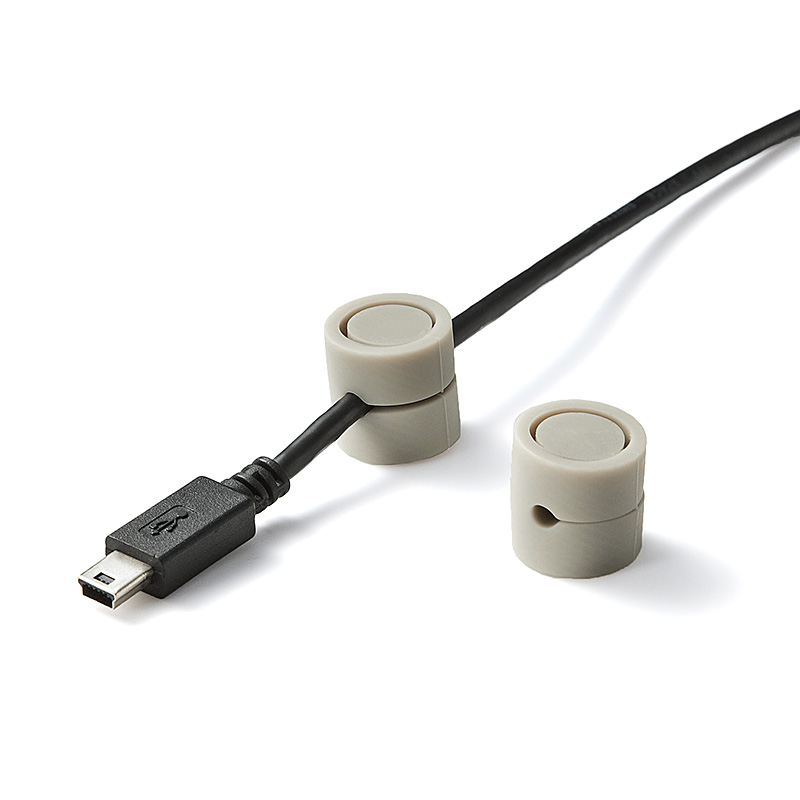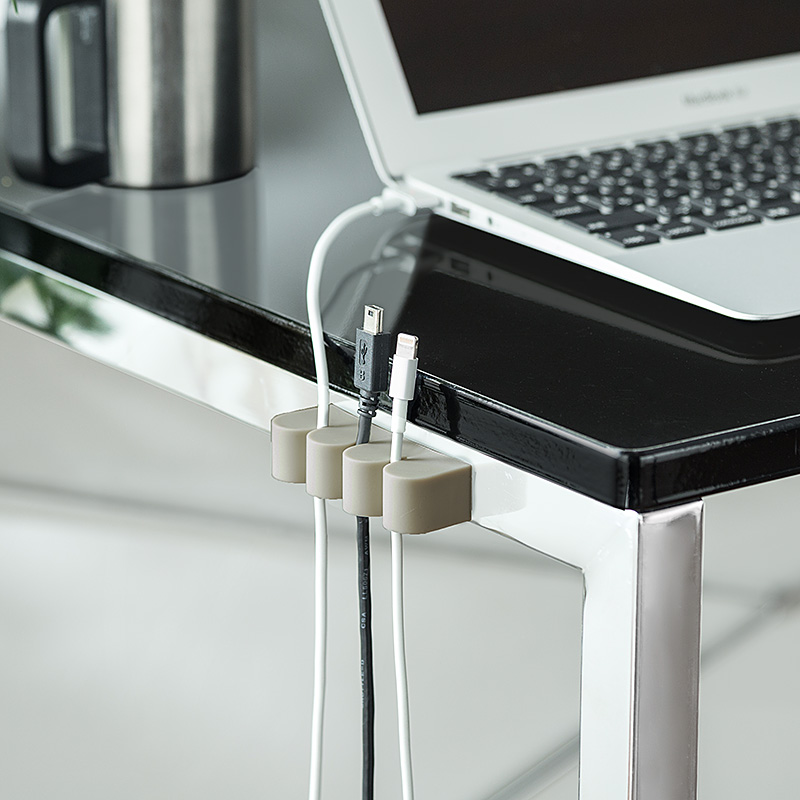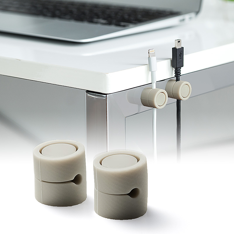 シリコン部分でケーブルを挟み、スチール製のデスクやパソコン本体、ブックエンドといった金属製の小物などに貼り付けて使える。