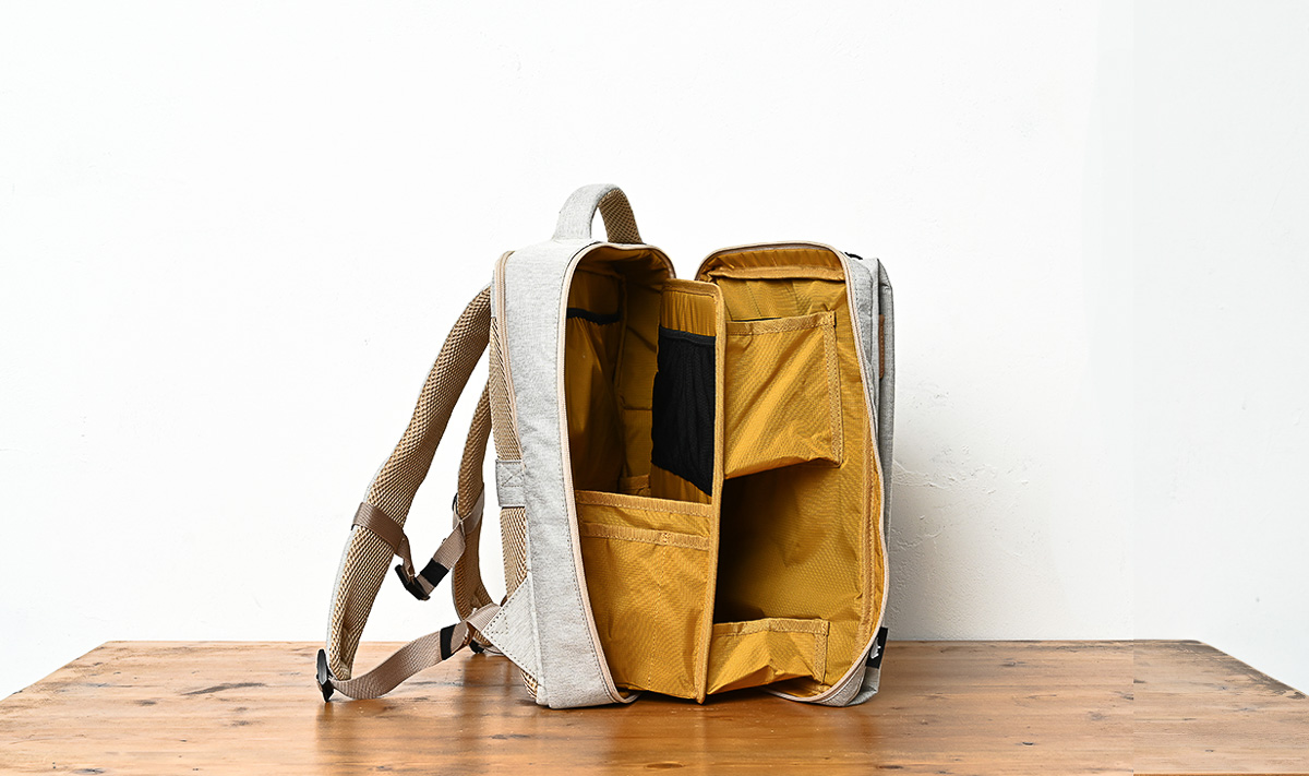バックパックでありながらガバッと観音開きに開くメイン収納部は、立体的な仕切りによっていくつもの収納ボックスに区切られていて、荷物が迷子になりにくい画期的な構造。この人気バッグが、従来モデルよりも一回り小さいサイズで登場し、さらに日常使いしやすくなりました。
