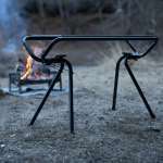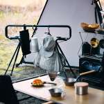 また天板やバーナーをすべて外してフレーム上部をたたんで閉じれば、見せる収納が楽しめるハンガーラックに早変わり。ランタンやグローブなどすぐ手に取りたい小物を掛けておくもよし、乱雑になりがちな調理小物の定位置とするもよし。こちらも脚を伸ばしてハイタイプとして使用すれば、長さがあるモノも吊るして収納できて便利です。