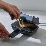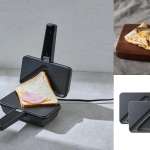 さらに付属の「ホットサンドプレート」を使用すれば、毎日の朝ごはんにピッタリな三角ホットサンドが焼ける点にも注目。食パンにハムやチーズ、ポテサラなど好きな具材を載せて、挟んで焼くだけ。周囲がシールされるので、具材がこぼれにくく、ミミを切らずともきれいに焼きあがります。