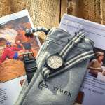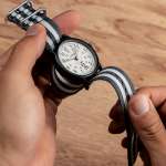 ナイロンストラップはシンプルなブラックの他に、ストライプ柄の特注ストラップが付属。引き通しタイプになっているため、その日の気分ですぐに交換できるのがうれしい!