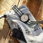 ちなみに、付属のナイロンストラップと時計ポーチのアジャスターに用いられているグレートとホワイトのストライプは、CHUMSのオリジナルリテイナー(メガネホルダー)がモチーフになっているんだとか。