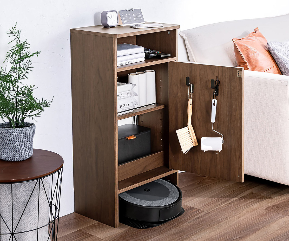 【次ページ】ぱっと見は棚、下部にロボット掃除機が収まる構造▶