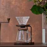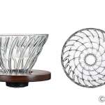 「V60耐熱ガラス透過ドリッパー ウォールナット」(3850円)は、底面に大きなひとつ穴が開いた円すい形。注いだお湯が制限されることなくスムーズに流れ、コーヒーを抽出します。ドリッパー内部のリブを高く上部までのばしたことで「蒸らし」の際にコーヒー粉から空気がしっかりと抜けるため、ネルドリップのような味わいになるのが特徴です。