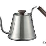 持ち手部分にウォールナットウッドを使用した「ドリップケトル ウォールナット」(7150円)(3月下旬発売予定)は、コーヒードリップに合わせて細く斜めにカットした注ぎ口がポイント。コントロールしやすい形状となっており、直火・IHの対応が可能です。