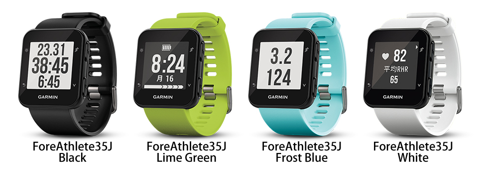 「ForeAthlete 35J(フォアアスリート35ジェイ)」(2万6784円)は、べーシック機能を備えたランニングウォッチに、光学式心拍計が搭載されている。手首に装着するだけで簡単に心拍データが計測でき、計測した心拍データは、対応のGarminデバイスへ転送することができる。