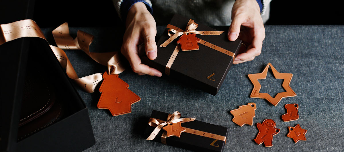 クリスマス特別ラッピングも凝っています。期間中クリスマスラッピングを希望すれば、品物にヌメ革製のオーナメントを付けてくれます。オーナメントは、ツリーに飾ったりキーリングに通してチャームにしたり、リボンを通して栞にするなど、思い思いのカタチで使えるもの。贈り物にほのかな革の香りを添えて…なんて大人の遊び心が感じられていいですね。