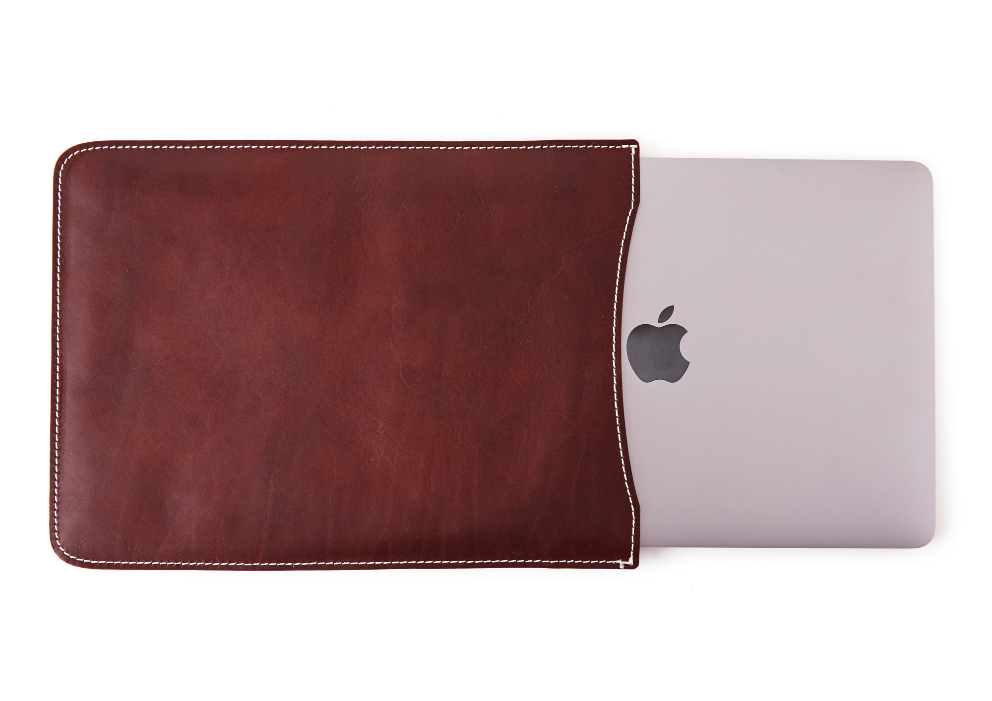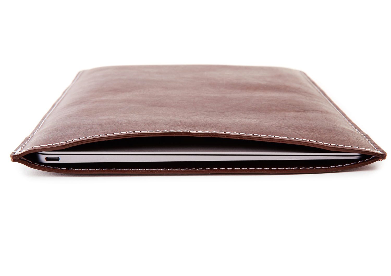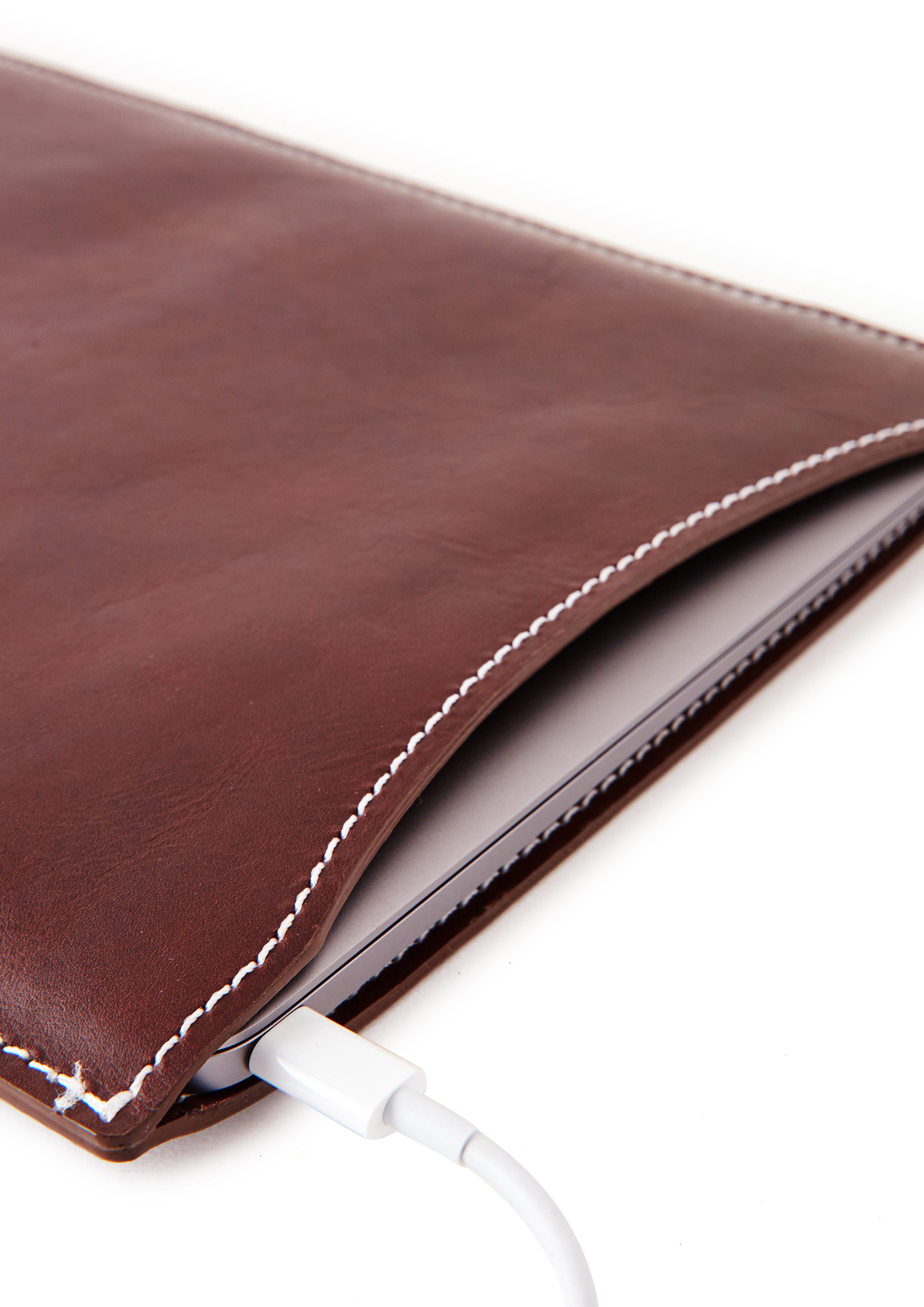 「Genuine Air Case」はMacBookがぴったり収まる封筒型ケース。そのまま鞄に入れて持ち歩くことを想定し、薄く軽いケースに仕上げています。革断面の処理には、 高い技術と手間をかけた「コバ磨き」という手法を用い、見た目にも感触にもこだわっています。