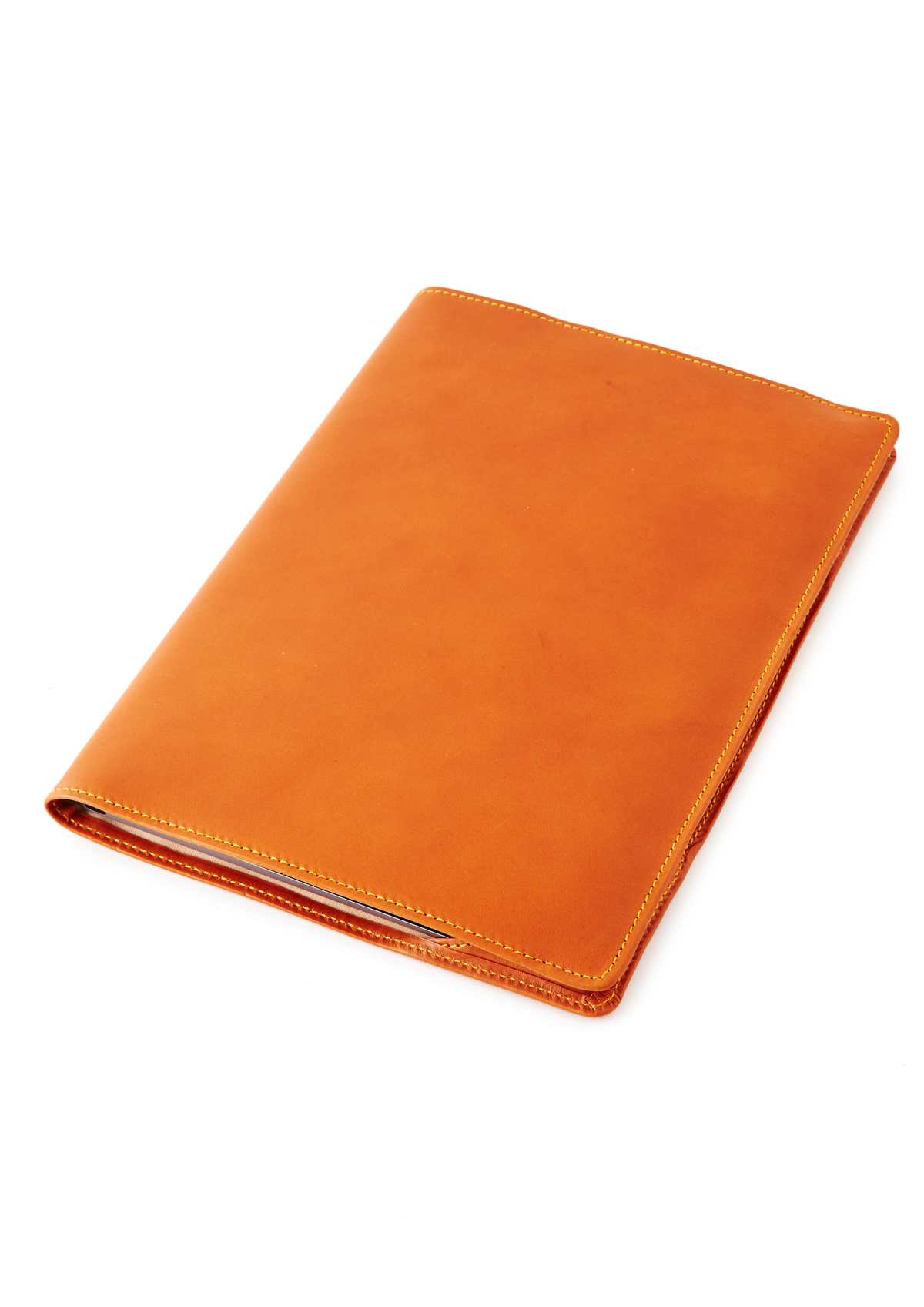 「羽衣-Hanegoromo-」はカバーをつけたまま開閉できるジャケット型カバー。革・ウレタン・スエードの三層構造で外部からの衝撃を和らげます。革の断面が外に出ない「へり返し」という手法を採用、丁寧な仕上がりは手仕事ならではの美しさです。