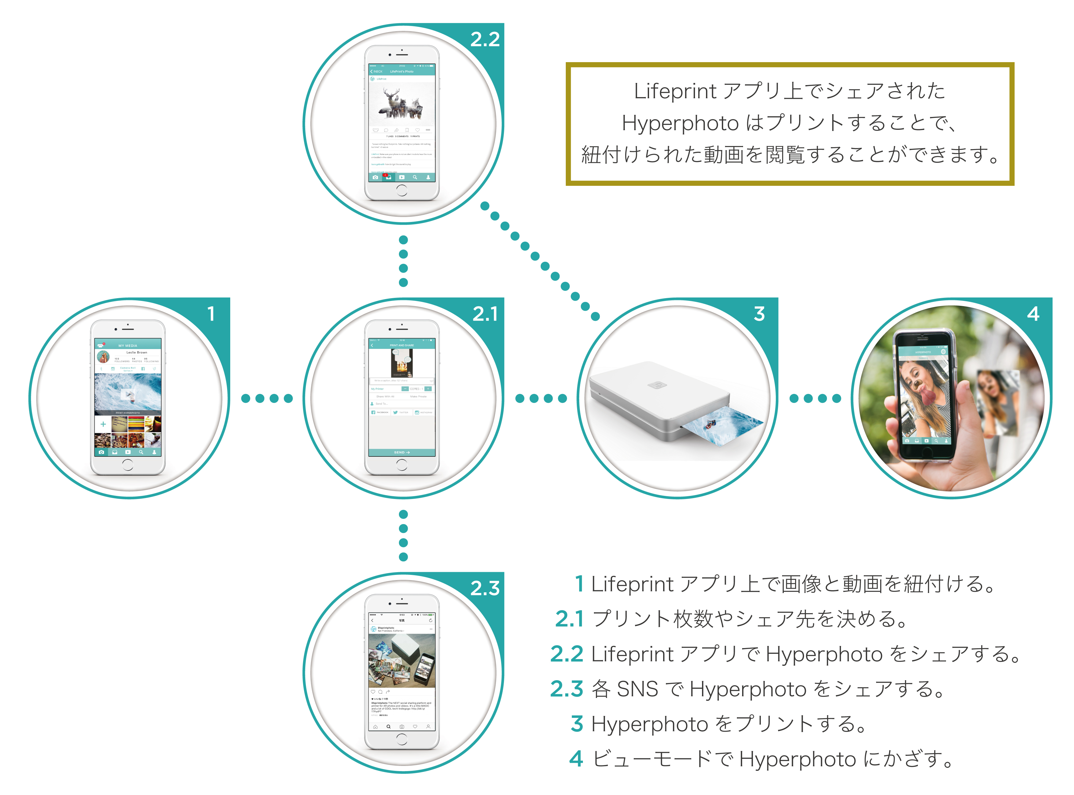 でも作り方が難しいんじゃ…? そんな心配ご無用です。専用アプリ「LifePrint Photos」(無料)を使ってカメラロールやSNS上にある画像を動画に紐付けるだけで「Hyperphoto」のできあがり。あとは完成した「Hyperphoto」をモバイルプリンター「Lifeprint」でプリントアウトするかSNSでシェアすればOK!