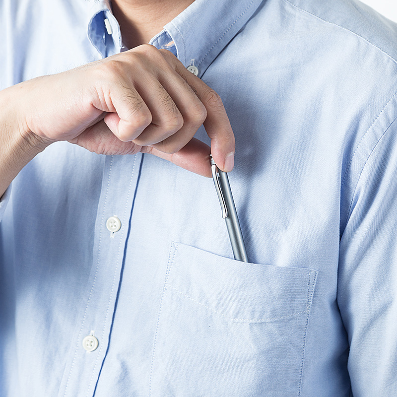 また前述の通り、乾電池や内蔵式の充電池を使っておらず、わずか18gという重量が長時間使用での疲れにくさを可能にしています。ビジネスシーンでの利用も想定し、胸ポケットに挿せるペンフック付き。