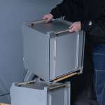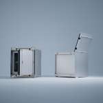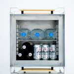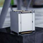 本体サイズは幅41.5×奥行き41×高さ50cm。金属の質感をそのまま活かしたキューブ型のデザインは、どこか出前用の“岡持ち”を思わせるユニークなルックスです。