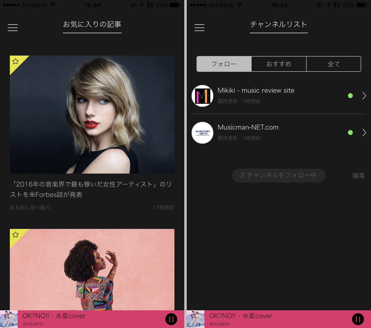 気になる記事は「お気に入り」に追加しておけば、メニュー内の「お気に入りの記事」から参照できます。また、気になるアーティストの記事を頻繁に配信するメディアは「チャンネル登録」しておくことで、登録したチャンネルの記事をまとめてチェックすることも可能です。