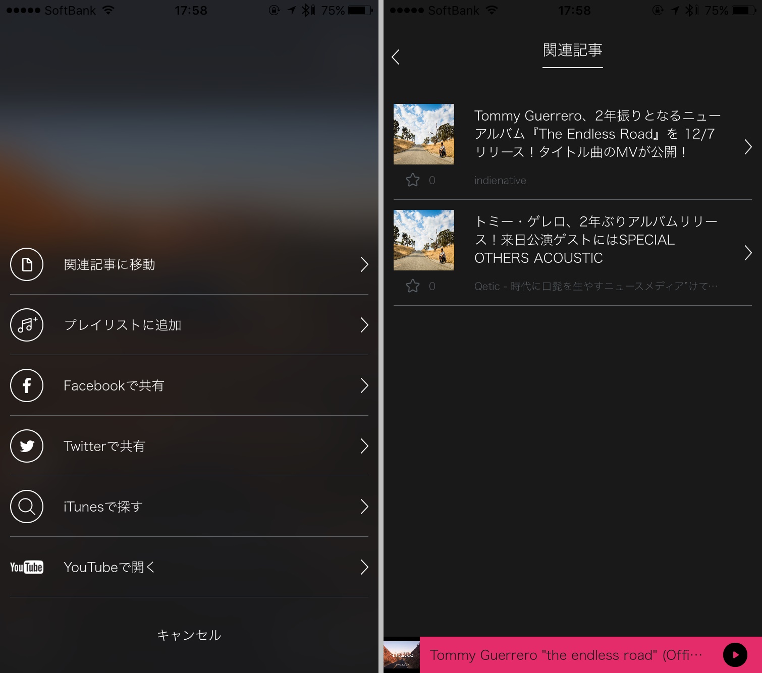 動画の視聴画面でメニューを開くと、その楽曲に関連する楽曲を聴けたり、SNSで共有したり、iTunesで楽曲を探したりすることも可能。気に入った曲をスムーズに購入できるのはありがたいですね。