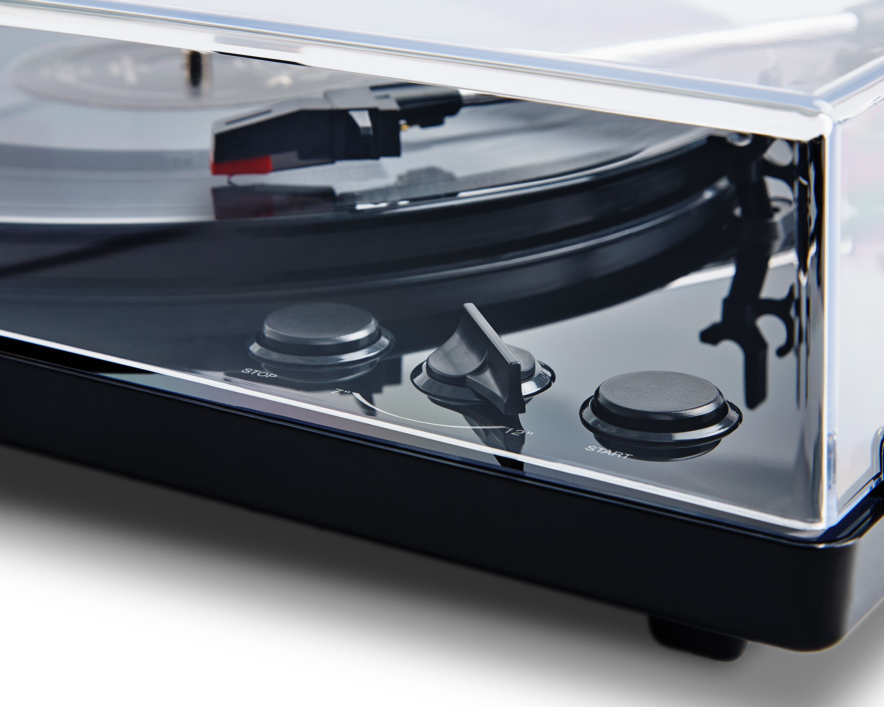 本体やレコード盤をホコリから守るダストカバーも付属。置く場所を選ばない、光沢のあるブラック仕上げのシンプルなデザインもいい。