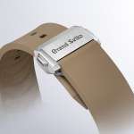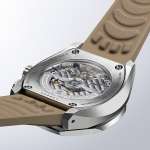 ケースの造形との統一感を感じさせる立体的なデザインが印象的ですが、裏に返せば肉球を思わせるデザインの突起が施されるといった遊び心も。手首に沿って緩やかなカーブを描いた裏ぶたと内向きのバックルと共に、快適な装着感をもたらします。
