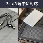 重量はパネル込みでも約1.1kgと、毎日持ち歩いても負担にならない軽量設計。また、充電用ケーブルはUSB Type-C、microUSB、Lightningと3種類の端子に対応しているので、さまざまなデバイスに給電が可能です。