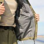 防水透湿膜を挟むように貼り合わせた3層構造の生地と、裏地に肌触りの良いトリコットを採用し、耐久性のある生地を外側に合わせることで、サラリとした着心地を実現。