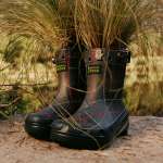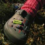 「Wellington Boots」は、全体にハウスタータンプリントを施し、両ブランドのロゴが描かれたPVCパッチをアクセントに配置した1足。こちらも「Clog」同様に9個のジビッツが付属し、ブーツ上部にジビッツを取り付けてコーディネートを楽しめます。憂鬱な雨の日も思わず気分が上がりそう!