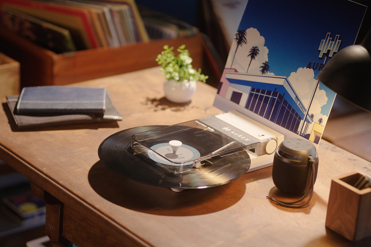 東芝エルイートレーディングが展開しているオーディオブランドAUREX(オーレックス)より発売中の「AX-RP10」(1万9800円前後)は、Bluetoothと有線の両方でスピーカーやヘッドホンなどと接続してレコードサウンドを楽しめるレコードプレーヤー。コンパクトサイズ&バッテリー内蔵で、好きな場所に持ち運んで使える汎用性の高さも大きな魅力です。