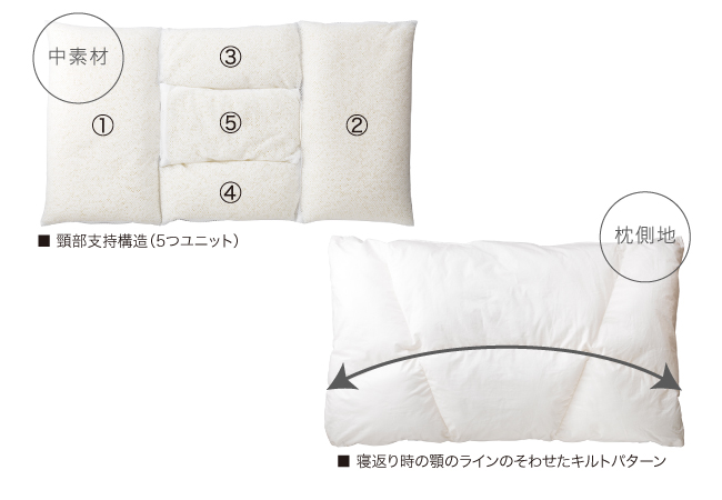 枕本体は5ユニット連結の頸部支持構造となっており、頭の丸みと首筋をしっかり受け止めて安定した寝姿勢をキープ。またキルトパターンは自然な寝返りをサポートし、横70cmの設計で大きな寝返りにも対応する。