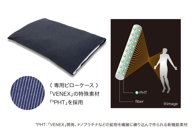 なんといっても特筆すべきは、身体回復能力アップのために開発された特殊素材 “PHT” を用いた専用ピローケース。PHT(Platinum Hermonized Technology)とは、VENEX(べネクス)社が独自に開発した新機能マテリアルだ。