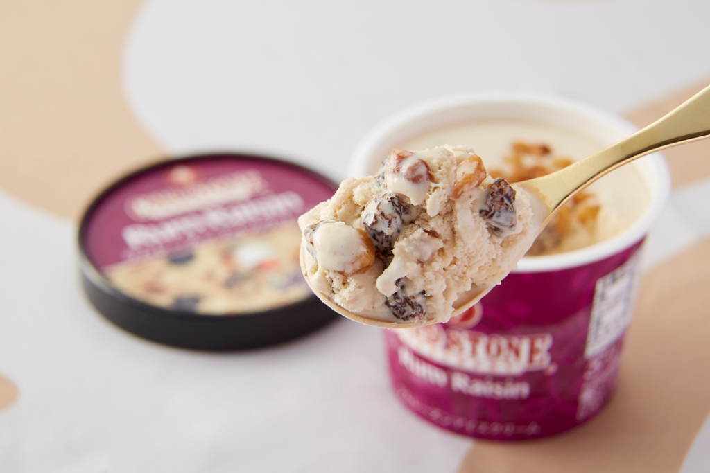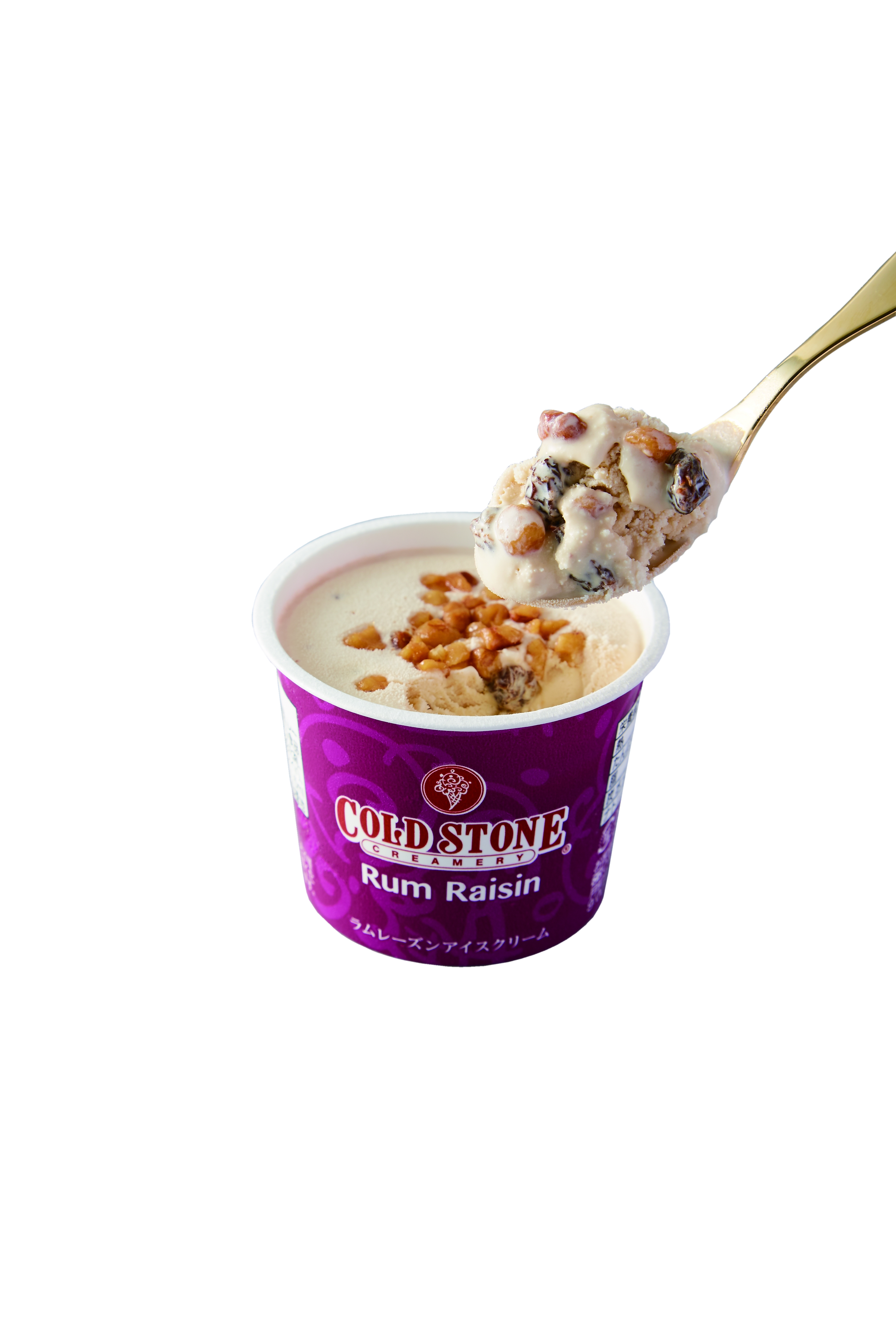 「コールド・ストーン・クリーマリー ラムレーズンアイスクリーム」は、ラム酒入りの濃厚アイスクリームに、たっぷりのラムレーズンとクルミを混ぜ込んだ大人向けのプレミアムなアイスクリーム。