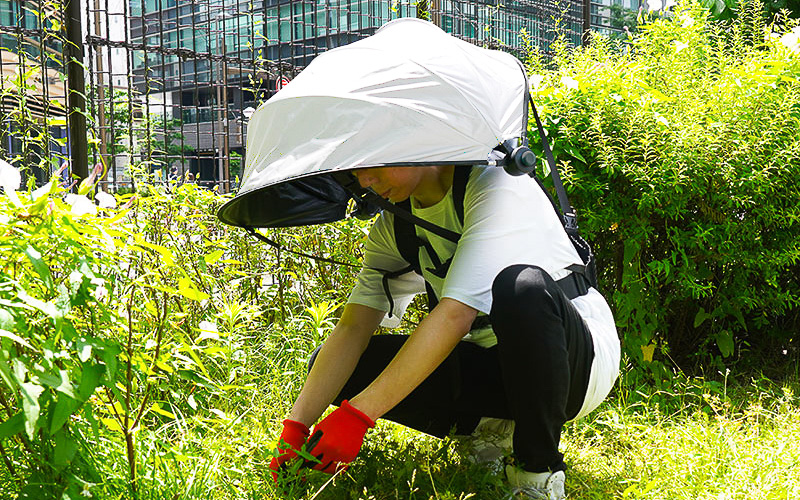 ただ、日傘をさすと片手がふさがってしまって面倒です。そこで注目したいのが、サンコーから発売中の「ハンズフリー背負える日傘」(1万2800円)。両手が開いた状態で作業を行える画期的なアイテムです。
