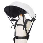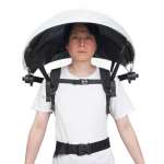 取り付け方法は簡単。リュックのように2本のショルダーハーネスで傘を背負い、腰のストラップで固定。左右の持ち手部分を前に倒すことで、傘が開いて頭部を覆います。カチッとなるまで開けて、傘ストラップで固定することで完成です。