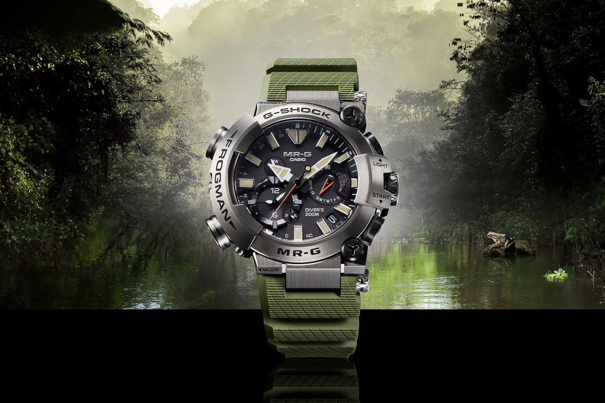 「MR-G」シリーズのダイバーズコレクション“FROGMAN”の流れを汲む今作は、アフリカ西部の熱帯雨林に生息し“世界最大のカエル”と呼ばれている「ゴライアスガエル」がモチーフ。バンドやインデックスのカラー、左右非対称の無骨なフォルムなどでイメージを表現し、タフさと力強さ、そしてG-SHOCKが貫いてきた堅牢性と精密さが、腕元にしっかり宿ります。