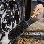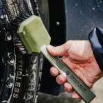 握りやすいグリップでゴシゴシ洗える「タイヤブラシ」(1450円)は、タイヤ周りの洗浄用に開発されたタイヤ専用ブラシ。硬くしっかりとした合成毛がタイヤのトレッドパターンの隙間に入り込み、頑固な汚れを効率的に除去します。
