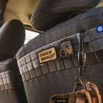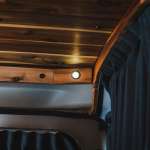 車中泊でのプライバシーを守るカーテンは、 シートカバーと同じグレーの生地を使うことで統一感を演出。フロントシートカバーの背面には大型のポケット、面ファスナー(メス)が縫付けられたモールシステムが付いているので、ベルクロパッチを貼ることができます。