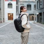 またバッグのサイドには、水筒や傘の収納に適した伸縮性のあるメッシュポケットとRFIDスキミング防止機能付きポケットも搭載するなど、日常生活を快適にサポートします。外寸は幅300×高さ410×奥行160mm。カラーはマットブラックのみとなります。