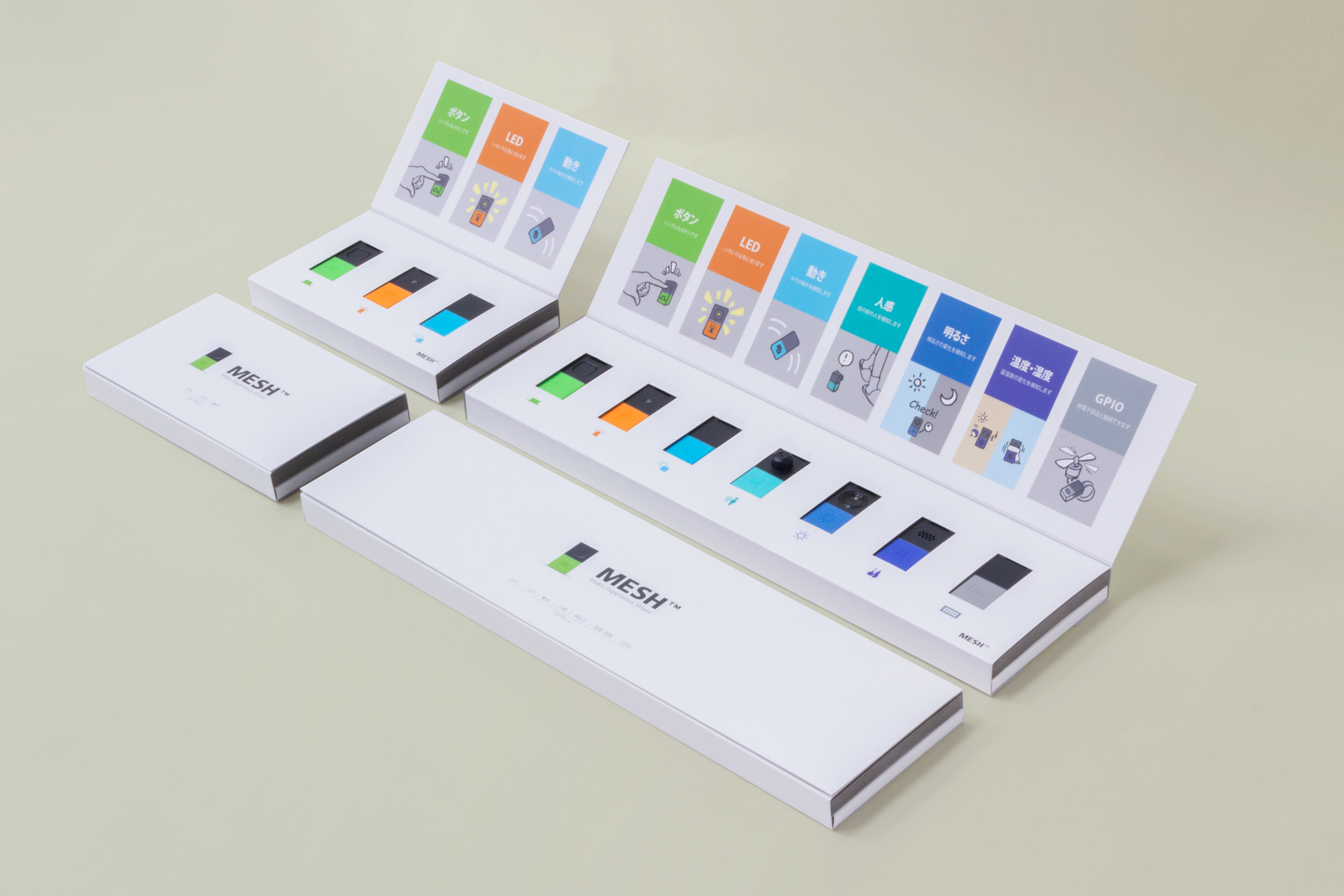 「MESH」は、無線でつながる小さなブロック形状の電子タグを組み合わせることで、難しい電子工作の知識やプログラミングの知識がなくても、「あったらいいな」と思う仕組みを、IoT技術を通して簡単につくることができる、ユニークなコンセプトの製品です。