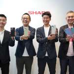 ▲左からシャープの通信事業本部 パーソナル通信事業部 商品企画部長 清水寛幸氏、執行役員 Co-COO 兼 スマートワークプレイスビジネスグループ長 小林 繁氏、通信事業本部 本部長 中江優晃氏、通信事業本部 パーソナル通信事業部 事業部長 川井 健氏。自信が感じられる発表会だった