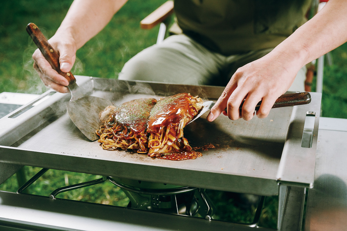 そこでご紹介するのがスノーピークから登場の「オタフクソースコラボ ステンレスお好み焼鉄板」(3万9600円)。その名の通り、広島お好み焼きファン御用達のソースメーカーとの共同開発により誕生したお好み焼き専用の脚付き鉄板。広島お好み焼きをおいしく焼き上げることにとことんこだわったプロ仕様の鉄板となっています。